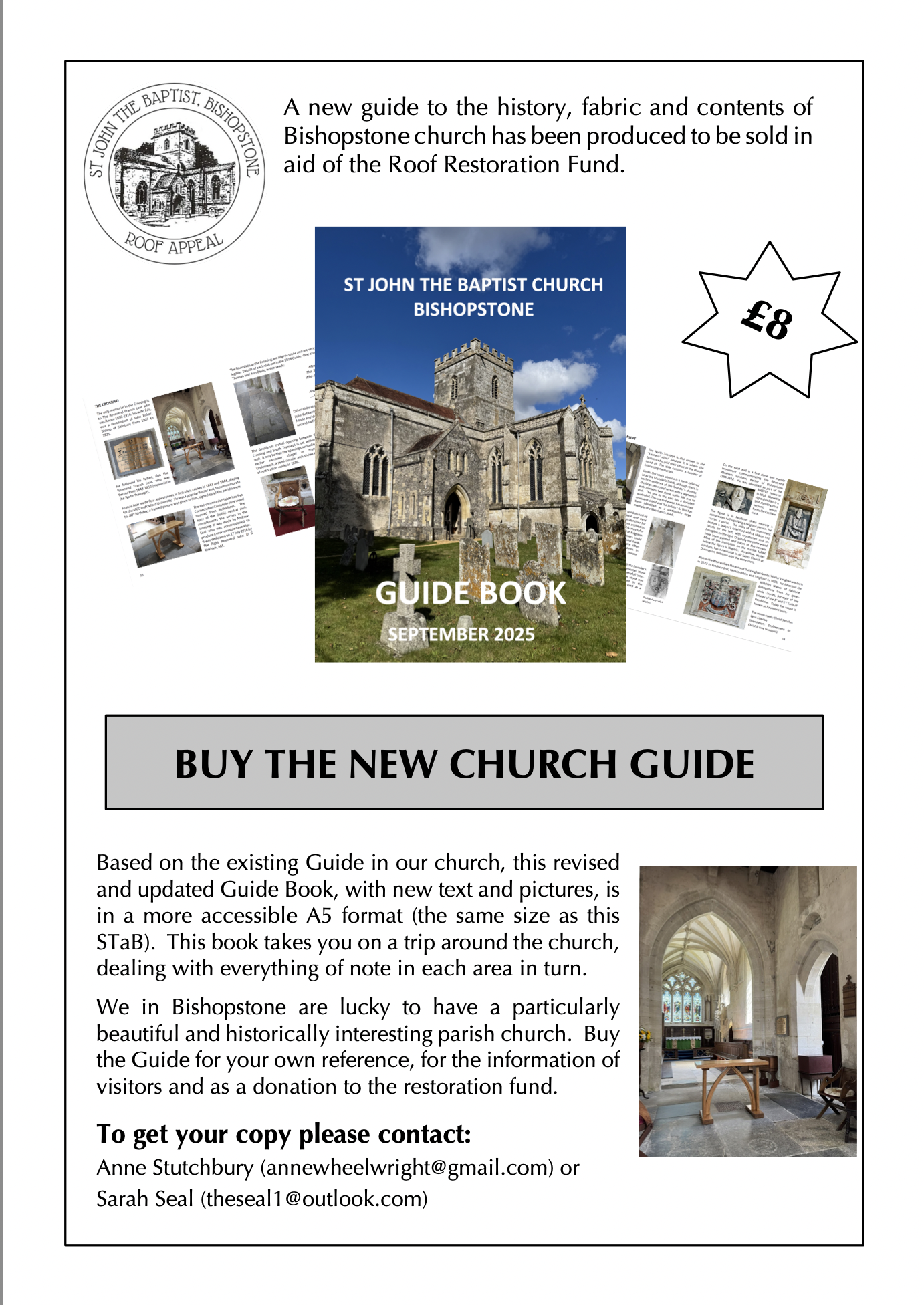 Details of the work of The Friends of Bishopstone Church are set out on a separate page on this website. Since the start of 2025 the Friends have undertaken a series of fund raising events in aid of the restoration project. These have included an Antiques Evening, Organ Recital, Open Gardens, Nearly New Sale, an Exhibition of Christening Gowns and two talks: one on the Troubles of Northern Ireland, and one on Introduction to Rocket Science. During 2026 they are planning many other events which will be advertised in STaB and on this website.