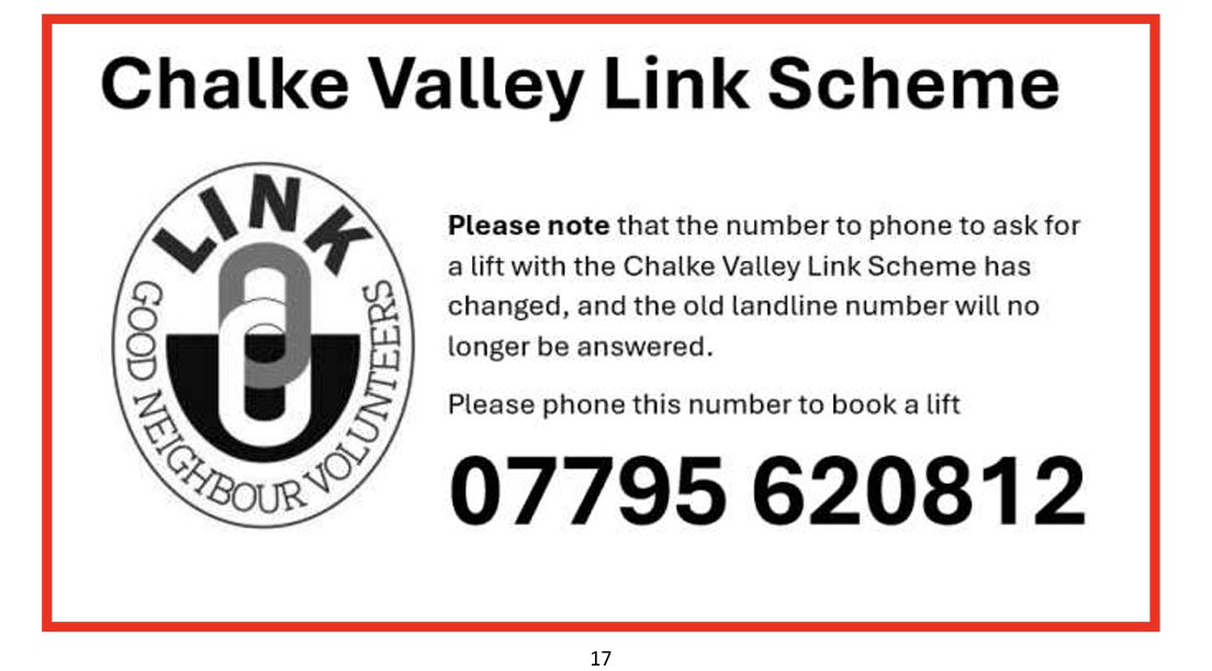 Serving the Valley from Berwick St John to Bodenham since 1996 and awarded The Queen's Award for Voluntary Service in 2006, the Chalke Valley Link Scheme is a Registered Charity that provides good neighbour support with transport and other practical help for Valley residents.