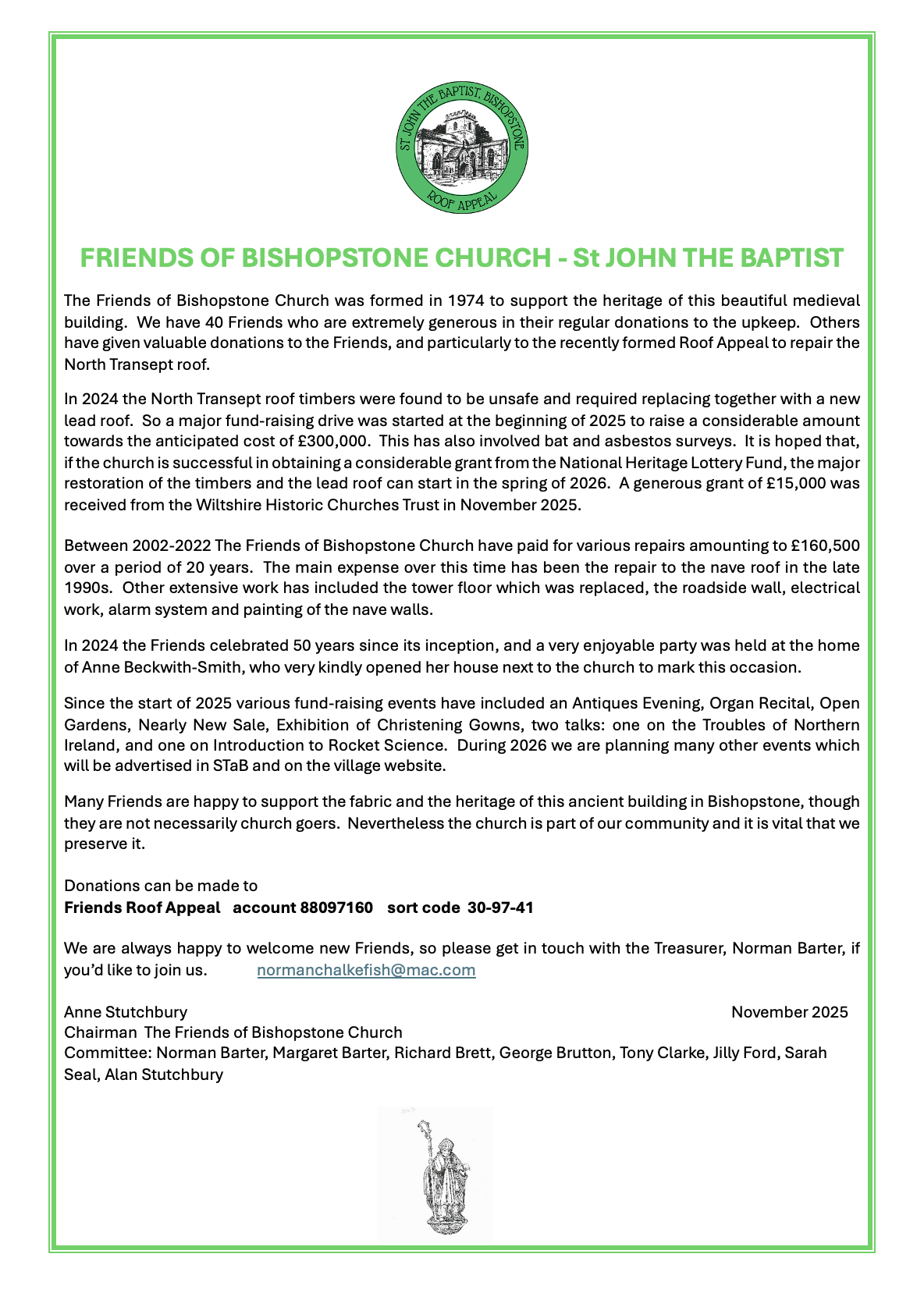 Recently, there has been mention in the media of property owners discovering that they have a responsibility for paying for repairs to their local church. This is known as Chancel Repair Liability whereby a parochial church council can require owners of former church land to meet the cost of repairing the church chancel. The Bishopstone Parochial Church Council has undertaken research regarding the question of Chancel Repair Liability in the Parish of Bishopstone and Stratford Tony. This is information which might be of interest to potential buyers and sellers of property. Further details may be obtained from the PCC Secretary, Geoff Taylor – 01722 503081, taylorgeoffreyc@gmail.com